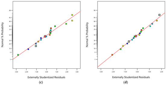 The parity graphic (see Figure 3a,b) and the normal percentage probability residual versus the studentized residual plot (see Figure 3c,d) demonstrate the model’s adequacy to predict both responses ( and ). Figure 3a,b reveal high-quality correlations between the experimental values of both responses ( and ) and both modeled responses ( and ). Figure 3c,d show normal distributions because the plotted points align closely to a straight line at a 45-degree angle. This suggests that the experimental responses follow a normal distribution. Additionally, the outlier values fall within the ranges ±1.05 and ±0.99 for and , respectively, indicating that the data-based models used to fit the responses were reasonably accurate, with minimal data register errors and high degrees of reproducibility.