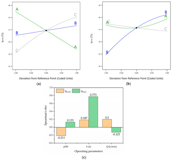 The perturbation graphics (Figure 4a,b) reveal that all the operating parameters (A, B, and C; i.e., the initial pH, current intensity, and volumetric flow rate, respectively) are important because of their distinguished slopes. However, the importances of the operating parameters for the response of the follow the order of the initial pH (A), current intensity (B), and volumetric flow rate (C) because of their slopes. Additionally, the importances of the operating parameters for the response of the follow the order of the initial pH (A), volumetric flow rate (C), and current intensity (B). Additionally, the Spearman rank values are shown in Figure 4c. Figure 4c reveals that the current intensity (B) is the most significant variable for because the Spearman rank value is 0.773. Meanwhile, the volumetric flow rate (C) is the most significant variable for because the Spearman rank value is 0.20. Also, pH0 exerts a negative effect on because of its negative Spearman rank value (−0.211), and Q displays a similar effect on because of its negative Spearman rank value (−0.125).