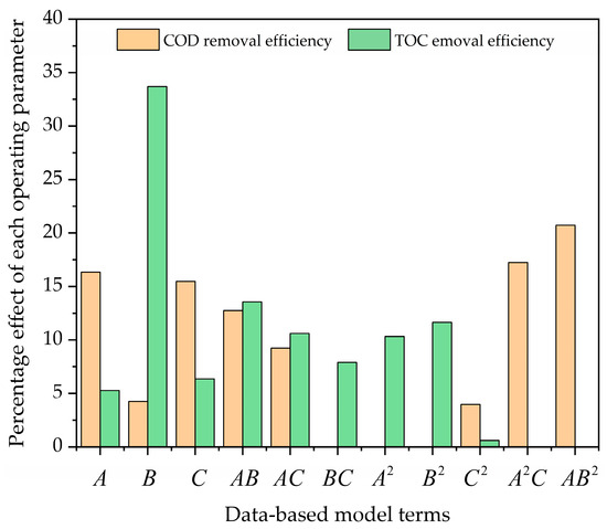 where is the surrogate model for the responses of the COD and TOC removal efficiencies; the β-values are the coefficients of the third-order polynomial function (see Equation (9)); and A, B, and C are the encoded operating parameters according to Equation (1). The β-values were calculated using the stepwise regression method in the Design Expert® V.10 software package.