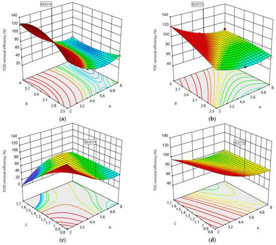 Experimental data responses (ηCOD and ηTOC) were modeled using surrogate models, according to Equation (9), in terms of encoded variables: