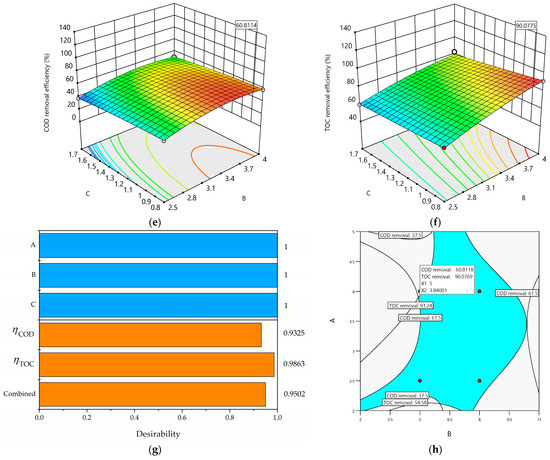 (a) The 3D plot of as a function of B and A; (b) the 3D plot of as a function of B and A; (c) the 3D plot of as a function of C and A; (d) the 3D plot of as a function of C and A; (e) the 3D plot of as a function of C and B; (f) the 3D plot of as a function of C and B; (g) desirability bar plot; (h) overlaid contour plot for three design operating parameters (pH0, I, and Q) and two response constraints ( and ) with the volumetric flow rate at the optimal level (C = 0.8 L/min).