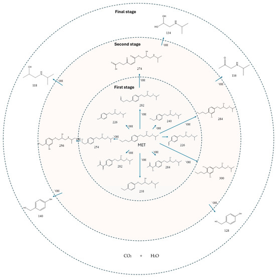 The LC/MS analysis of the byproducts from the electro-degradation of the MET molecule revealed 11 intermediates. It was also confirmed that the process occurs in three phases, which is consistent with previous reports.