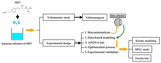 Scheme 1 depicts the flowchart diagram of the methodology employed in this research. Also, this scheme shows the stages followed to conduct the data-based modeling, multi-objective optimization, and multi-criterion decision-making to maximize the electro-oxidation of the metoprolol over boron-doped diamond electrodes in a flow-by reactor. Additionally, each step is thoroughly described in detail in the following subsections.
