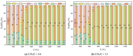In the absence of reduction gas, the definition of the distribution of carbon is consistent with that in the carbon fixation reactor (Equation (15)). However, when CH4 is utilized as a reducing gas, carbon deposition occurs, and the rate of carbon deposition (CDC) equates to Equation (16) where Ci represents solid C.