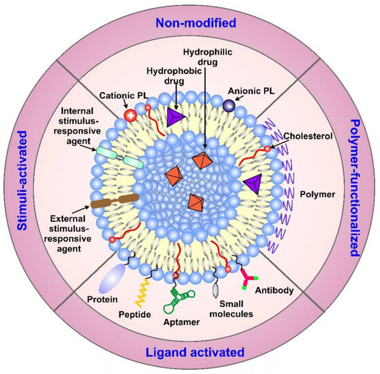 Surface modification strategies of liposomes, together with their classification. The modified carriers can contain active components, such as drugs, small molecules, proteins, and/or targeting moieties, such as antibodies, peptides, aptamers, etc., conjugated on the surface of the vehicles through different linkers, non-covalent or covalent bonds, and electrostatic interactions. Abbreviation: PL—phospholipid. Reprinted from [19] under an open-access creative common CC-BY license.