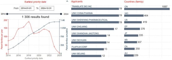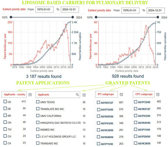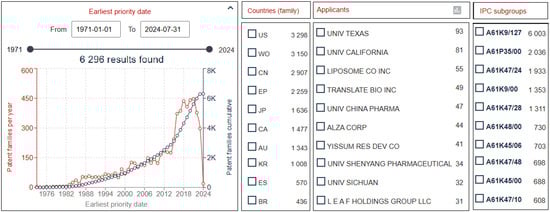 The patent application distribution shows a peak in the period 2016–2021, with more than 300 yearly, and 2021 is the year with the highest number of published patent applications, with 447 documents. Today, it seems to be decreasing, with “only” 19 records in the first 7 months of 2024. The United States is the country with the greatest number of priority patent applications filed in this technical field (3298), followed by WO patent applications (3150) using the international patent application system (PCT) administered by the WIPO [37], the Republic of China (2907), European Patent (EP; 2259), Japan (1636), Canada (1477), Australia (1343), the Republic of Korea (1008), Spain (570), and Brazil (436), as the first 10 countries. The largest number of patent applications come from universities (The University of Texas System (US), The Regents of the University of California (US), Shenyang Pharmaceutical University (CN), and Sichuan University (CN)) and companies (The Liposome Company, Inc. (US), Translate Bio Inc. (US), Alza Corp. (US), Yissum Research Development Company of the Hebrew University of Jerusalem Ltd. (IL), and L.E.A.F. Holdings Group LLC (US)), as the first ten applicants.