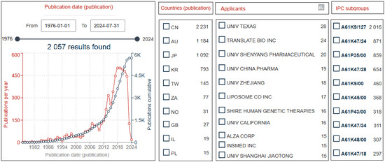 Searching criteria were narrowed to include only granted patents. During the time from the first application, a total of 2057 patents were granted in the period 1976 to July 2024, focusing on liposome drug delivery systems (Figure 2). Regarding countries, the Republic of China has the largest number of granted patents in this search criteria (2231), followed by Australia (1184), Japan, (1092), the Republic of Korea (793), and Taiwan Province of China (145), as the first five. The greatest number of granted patents also comes from universities (The University of Texas System (US), Shenyang Pharmaceutical University (CN), China Pharmaceutical University (CN), Zhejiang University (CN), The Regents of the University of California (US), and Shanghai Jiao Tong University (CN)) and companies (Translate Bio Inc. (US), The Liposome Company, Inc. (US), Shire Human Genetic Therapies, Inc. (US), Alza Corp. (US), and Insmed Inc. (US)), as the first 11 patent owners. The distribution shows a peak in the period 2016–2022 with more than 100 granted patents yearly, and the highest number of patents (186) was granted in 2018 (Figure 3 and Figure 4), with a decreasing trend this year.