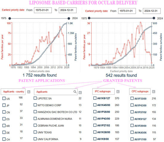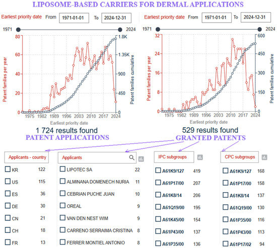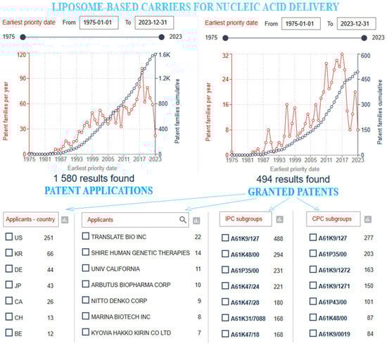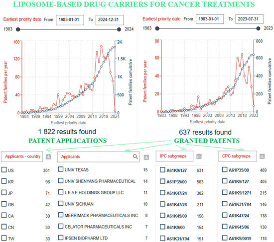 The search methodology for relevant patent information was conducted on the reference database Espacenet, with free access to over 150 million patent documents from over 100 countries, provided by the European Patent Office (EPO) [32]. This search was carried out by including keywords and classification symbols (using both the International Patent Classification (IPC) and Cooperative Patent Classification (CPC)). The IPC was provided by the World Intellectual Property Organization (WIPO) [33], used by above 100 National Patent Offices and frequently used for searching. It is a hierarchical system for the classification of patents and utility models according to the different areas of technology to which they pertain, independent from language symbols [34]. The CPC is a classification system developed by the EPO and the United States Patent and Trademark Office (USPTO), based on the previous European classification system (ECLA), a more detailed version of the ICP [35]. Both classifications, the IPC and CPC, are hierarchical classification systems that separate all technical knowledge using the descending order of hierarchical levels: section, class, subclass, group, and subgroup [36]. The hierarchy among subgroups is determined solely by the number of dots (•) before their titles, not by the numbering of the subgroups. To avoid repetition, dots before a group title are used instead of the titles of its hierarchically upper-level groups. Liposomes and their derivatives are classified in the A61K9/00 group and A61K9/127 subgroup, while the classification symbol for processes for preparing is A61K9/1277. Medicinal preparations containing active ingredients are classified into group A61K31/00, while those characterized by the non-active ingredients used, e.g., carriers or inert additives, targeting or modifying agents chemically bound to the active ingredient, are classified into group A61K47/00. The main groups and particularly relevant subgroups of IPC/CPC codes, selected and applied for this search, are listed in Table 1.