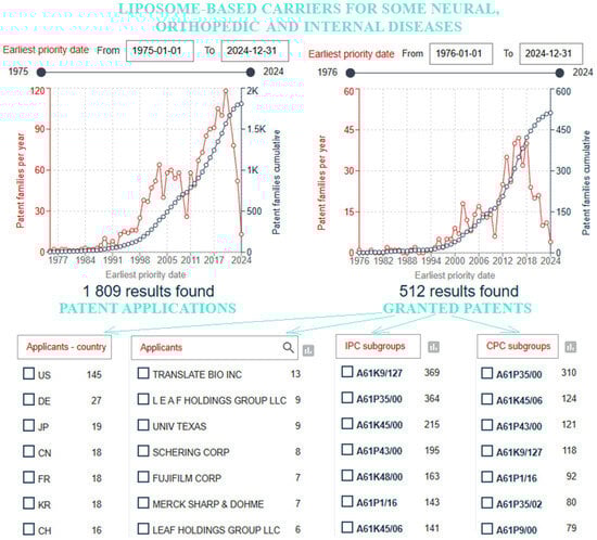 During the last ten years (from 2014 to 2024), 1306 patents were granted. The most numerous results and activities come from companies and universities in the Republic of China (Figure 4). This result suggests that the liposome-based drug delivery systems and correlated technologies are near the peak of research. By analyzing the obtained data, it was observed that many of the applications were based on liposomes and their application for medicinal preparations containing active ingredients. The most common were anti-cancer drugs, with a large and diverse class of medications. Data analysis indicated that the medicinal preparations containing genetic material (inserted into the cells of the living body) for genetic disease treatment, gene therapy, and mixtures of active ingredients were objects of patent protection. Also, objects of protection were drugs for specific purposes. Additional narrowed search criteria were included only for granted patents in specific fields, e.g., for different obtaining methods (classical or supercritical) or their pharmaceutical applications.