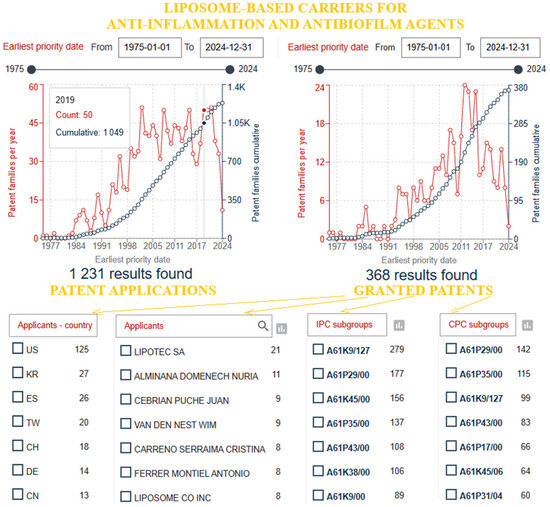 A few scientific review papers provide short reports on patent documents for liposome-based carriers, without a whole, up-to-date patent analysis [30,31]. This overview aims to provide a patent analysis of liposome-based carriers, from the first patent to the newest inventive patented solutions, focused on the aspects of procedures for obtaining them and pharmaceutical applications. Patent activity and filing trends of liposome-based drug carriers can be used as inspiration for future research and data sources for problem-solving in pharmaceutical or cosmetic applications.