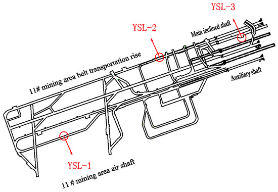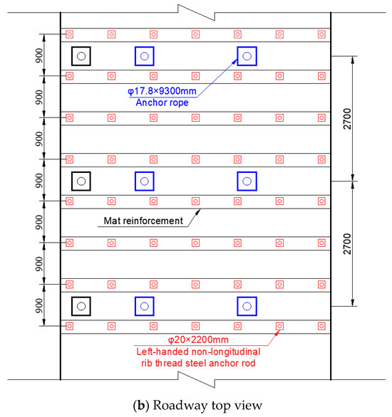 | Roof bolting | The top and left side bolts adopt Φ20 mm left-handed non-longitudinal rib screw thread steel bolt. The length of the rod body is 2200 mm, and its supporting components include a wear-reducing washer and a damping nut. The Φ18 × 1800 mm FRP anchor rod is used for the right-side anchor rod. The length of the anchor rod is 1800 mm and the row spacing is 900 mm. |