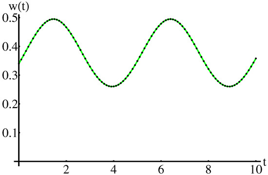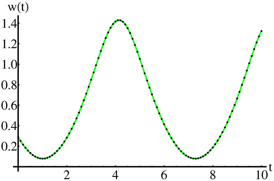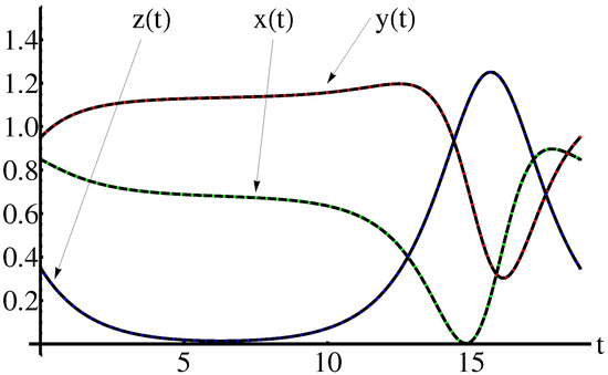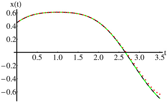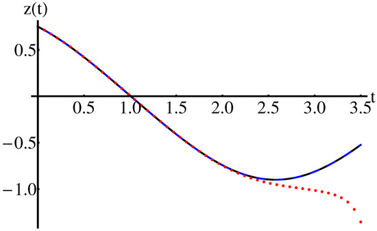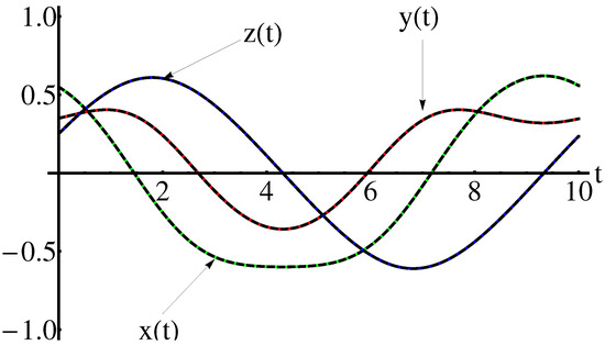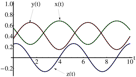 The functions using Equation (A3) for initial data: , , , physical parameters: , and index : OPIM solution (dashing black line) and numerical results (solid color line: green line for , red line for , blue line for ), respectively.