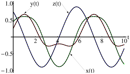 The functions using Equation (A5) for initial data: , , , physical parameters: , and index : OPIM solution (dashing black line) and numerical results (solid color line: green line for , red line for , blue line for ), respectively.