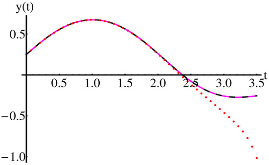 A comparison between the OPIM solutions , , , the corresponding iterative solutions given in Equation (51) and the corresponding numerical ones are represented in Figure 13, Figure 14 and Figure 15 and in Table 5. The accuracy of the OPIM approach is highlighted by this analysis. This comparative analysis highlights the efficiency and the accuracy of the OPIM method using only one iteration.