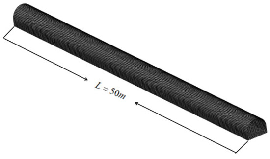 The model is an arched tunnel [36], semi-enclosed, with cross-sectional dimensions shown in Figure 1. Grid subdivision employed a combination of Hex/wedge elements and the Cooper method, featuring a grid size of 0.1 m and comprising a total of 348,000 grids, which adequately satisfies the simulation demands of the model. The result of the grid division is shown in Figure 2. Gas accumulation in the tunnel is arranged with different quantities and intervals (each explosion source has an accumulation length of 5 m), as shown in Figure 3 and Figure 4.