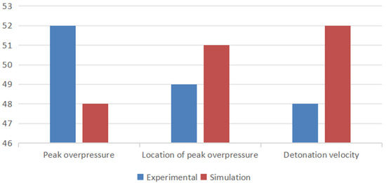 Based on Table 2 and Figure 5, it can be observed that under the condition where the gas accumulation length in the tunnel is 5 m, the two sets of data are of the same order of magnitude in the comparison of parameters, including peak overpressure, the location of the peak overpressure, and detonation velocity. The differences in the data are not significant. The deviation between the simulation and the experimental data is within 10% (considering there are differences in the parameters of the objects studied). Therefore, it can be concluded from this comparison that the numerical simulation is reasonable.