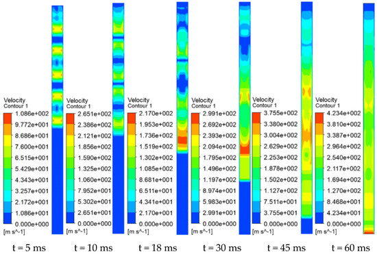 From Figure 6, it can be seen that when the explosion occurs, shock waves are generated simultaneously from two explosion sources (for convenience of analysis, the gas accumulation area near the closed end is referred to as explosion source 1, and the other accumulation area in the tunnel is referred to as explosion source 2). The shock wave from the left side of explosion source 1 is restricted by the closed end, while the shock wave from the right side propagates towards the exit. In contrast, the shock wave from explosion source 2 propagates in both directions without any restrictions. At this time, the propagation speed of the shock waves at the center of the explosion sources and the closed end is slower than that within the tunnel (t = 1–5 ms). As the shock waves propagate, the right-side shock wave from explosion source 1 meets the left-side shock wave from explosion source 2 in the tunnel (the air in this region is subjected to compression from both ends), cancelling out each other’s momentum and resulting in near-zero speed at that location (t = 13 ms). Subsequently, pressure waves are generated in this region and spread towards both sides. The shock wave propagating towards the left closed end reflects off the end and propagates again towards the right, thereby creating multiple high-velocity regions in the tunnel (the reflected wave from the closed end, the rightward pressure wave generated from the encounter region of the shock waves, and the right-side shock wave from explosion source 2) (t = 40–55 ms). Over time, the left-side shock waves gradually catch up with the rightmost shock waves (as the propagation distance increases, the energy consumption causes the speed of the rightmost shock waves to continuously decay) (t = 68–75 ms).