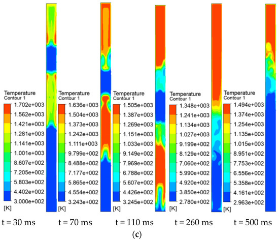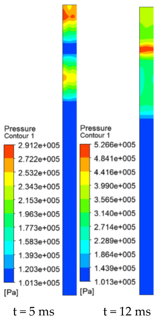 Figure 15 shows the contour plots for the double explosion source model with three different intervals (5 m, 10 m, and 15 m). From the figure, the patterns of the explosion flames, the formation of tulip flame fronts, the propagation of the flame from explosion source 2 through the tunnel, and the final distribution of the flame within the tunnel are consistently similar. This indicates that variations in the interval distance between the explosion sources have minimal effect on the flame propagation process after the explosion. From the dynamic changes in the contour plots, it is observed that the flame formed by explosion source 1, near the closed end, can never catch up with the flame formed by explosion source 2. The reason for this is similar to previous analyses, that is, the high-pressure region between the two explosions suppresses the forward spread of flame 1 while simultaneously promoting the propagation of flame 2 towards the exit. Additionally, as the interval distance increases, the time required for the flame to propagate out of the tunnel decreases. For example, in the 5 m interval model, the flame reaches the exit in 160 ms, while in the 10 m and 15 m intervals, it takes 130 ms and 110 ms, respectively.