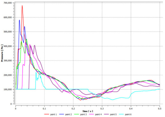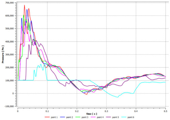 To determine the impact of explosion source interval distance on the pressure distribution within the tunnel following an explosion, a comparative analysis of the pressure dynamic changes in the tunnel post-explosion was conducted for three different models. Monitoring points were set from left to right as follows: Point 1 at the closed end, Point 2 at the center of explosion source 1, Point 3 at the middle of the front section of the tunnel, Point 4 at the middle of the tunnel, Point 5 at the middle of the rear section of the tunnel, and Point 6 at the tunnel exit, as shown in Figure 16.