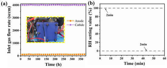(a) Inlet gas flow rate of a single cell under OCV-based ADT condition (the inset was the image of the tested fuel cell); (b) humidity setting point for the RH cycling-based ADT condition.