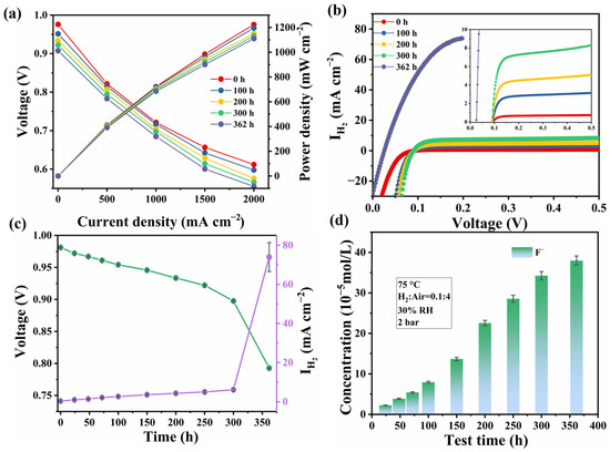 During the OCV-based ADT, polarization curves were investigated every 100 h, as shown in Figure 2a. The OCV before the ADT was about 0.978 V, and a high voltage can cause chemical degradation [16]. The OCV decreased ~20 mV in the first 100 h, and the voltage decay rate reached 2.51%. The OCV was monitored every 100 h during the OCV-based ADT, the OCV at 200 h, 300 h and 362 h was 0.934 V, 0.922 V and 0.908 V, respectively, the voltage decay rate reached 4.19%, 5.41% and 6.92%. In addition, the degree of hydrogen penetration through the PEM (hydrogen permeation current density) [28] was recorded concurrently at the same time interval. As shown in Figure 2b, the growth trend of hydrogen crossover LSVs within the initial 300 h was the same as the downward trend of OCV. After 362 h of the OCV-based ADT, the hydrogen crossover limiting current density increased sharply over 73.94 mA/cm2, and at this point, the PEM fuel cell was considered failed [29].