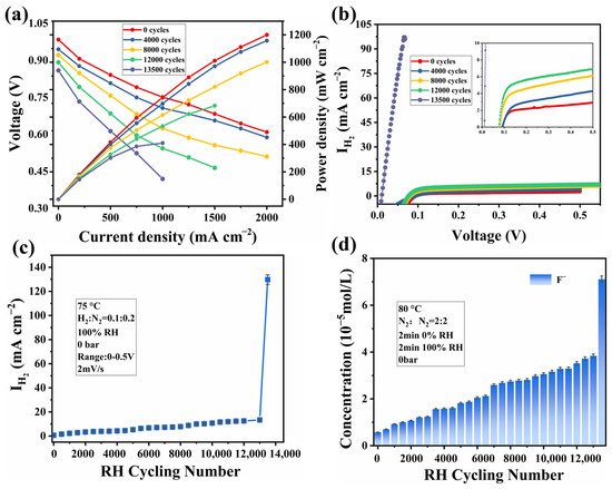 (a) Polarization curves of the PEMFC during RH cycling-based ADT; (b) H2 crossover LSVs during RH cycling-based ADT; (c) H2 crossover limiting current density during RH cycling-based ADT; (d) variation of FRR during RH cycling-based ADT.