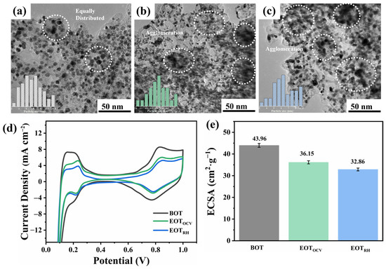 TEM was performed to study the effect of OCV-based ADT and RH cycling-based ADT on the microstructure of the cathode catalyst (Figure 4a–c). The Pt particles were uniformly distributed without significant aggregation at the beginning of test (BOT). The average particle size was 4.67 nm. At the end of OCV-based ADT (noted as EOTOCV), the Pt particles in the cathode showed noticeable aggregation. The distribution of Pt particle size was not uniform, and the particle size became larger (Figure 4b), which reduces active sites and leads to a decrease in the electrochemically active surface area (ECSA). Figure 4c showed that after RH cycling-based ADT (EOTRH), the Pt particles in the cathode also exhibited larger aggregation and particle size compared to OCV-based ADT.
