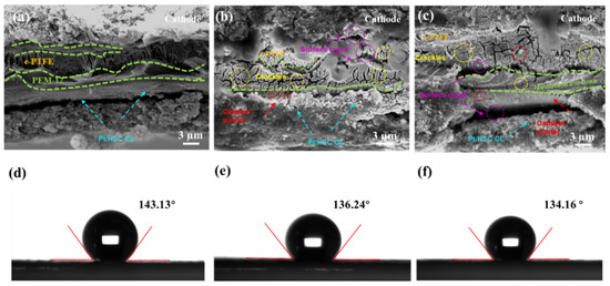 Cross-sectional SEM images of the MEA at the (a) BOT, (b) EOTOCV and (c) EOTRH; The contact angle of the cathode GDL at the (d) BOT, (e) EOTOCV and (f) EOTRH.