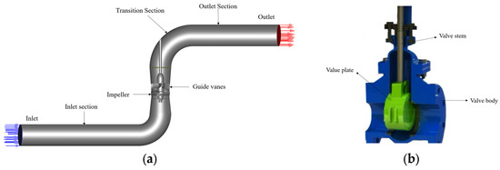 Schematic Diagram of the Axial Flow Pump Water Model and Valve. (a) Schematic Diagram of the Axial Flow Pump Water Model; (b) Schematic Diagram of the Gate Valve Model.