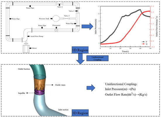 Currently, research on the startup process of axial flow pumps mainly employs one-dimensional calculation methods [4]. By applying reasonable simplifications and approximations, the water flow is approximated as a one-dimensional flow, and then an appropriate mathematical model is introduced for solving and analysis [5]. Zhang et al. [6] provided the time-frequency patterns of fluid pressure fluctuations and structural vibrations at the same location in vertical axial flow pumps, offering important theoretical guidance for the optimization design and safe operation of vertical axial flow pumps. Guo et al. [7] found that due to the end wall effect, there is a significant discrepancy between the calculated and design values of the flow field structure. When designing axial flow pumps, the impact of the crowding factor should be considered. Zhang et al. [8] discovered that a pump device equipped with a pre-opened vacuum relief valve experiences significantly reduced influence from transient impact characteristics on its flow field during the pump startup process. Currently, for many large-scale units, a 1D-3D coupling approach is mostly used for calculations. Song [9] employed a 1D-3D coupling numerical simulation method to perform the numerical simulation and analysis of a typical transient process at a pumped storage power station. Liu [10] used a 1D-3D software coupling calculation method to study the intake and exhaust systems of the TBD620V12 diesel engine under real operating conditions. Fu et al. [11] developed a one-dimensional and three-dimensional (1D-3D) coupled transient flow simulation method to study the effects of nonlinear fluctuations in pressure and hydraulic thrust on the impeller. Wang [12] conducted a comparative analysis using both one-dimensional simulation and 1D-3D coupled simulation methods to study the impact of the geometric structure of the airflow transmission pipeline on the performance of a five-stroke engine. Liu et al. [13] used a one-dimensional and three-dimensional (1D-3D) coupled computational fluid dynamics (CFD) method to simulate the extreme scenario of two pump-turbines simultaneously suppressing the load in a prototype of a pumped storage system. Liu et al. [14] employed a one-dimensional and three-dimensional coupled computational fluid dynamics method to simulate the 100% load rejection transient process of a medium-head power plant. They analyzed the evolution and impact of cavitation cavities and evaluated the safety implications. Lv et al. [15], based on a 1D-3D coupling method and dynamic mesh technology, simulated the process of guide vane closure during pump shutdown for an ultra-high-head pumped storage unit. Tang et al. [16] used a one-dimensional and three-dimensional (1D-3D) coupled method along with a fluid–structure interaction (FSI) method to simulate the evolution of rotational dynamic stress in a prototype pump-turbine during the load suppression transient process. The above studies indicate that 1D-3D coupling is widely used across various fields. This method simplifies the computation process by using three-dimensional simulation for the parts that require detailed analysis and one-dimensional simulation for other parts, facilitating the exploration of internal flow characteristics.