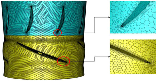 To ensure the accuracy and reliability of the calculation results, polyhedral meshing was performed on the three-dimensional fluid domain of the axial flow pump using ANSYS Fluent Meshing. Boundary layer mesh refinement was applied to the impeller blades and guide vanes. A schematic diagram of the mesh for the main components of the axial flow pump is shown in Figure 3. To verify the impact of the mesh scale on simulation performance, seven different mesh scales were compared. The calculation results are shown in Figure 4. When the head in the results stabilized, the model mesh number was determined to be 2,846,130.