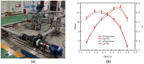 Experimental Validation of the Model Pump. (a) Schematic Diagram of Axial Flow Pump Experiment Setup; (b) Comparison of Calculated and Experimental Values.