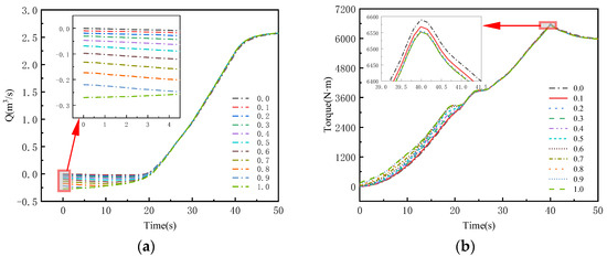 In Figure 7, it can be seen that when the gate pre-opening angle is 0.2, both the maximum torque and backflow rate during the pump startup are relatively small. The maximum torque is 6555.79 N·m, which is 91.94% of the calculated torque, and the maximum backflow rate is 0.0421 m3/s, which is 1.71% of the design flow rate. After the gate opening angle reaches 0.3, with an increasing pre-opening angle, the maximum torque in the pump gradually stabilizes and is no longer influenced by the opening angle. The maximum torque remains around 6552 N·m, which is 91.88% of the calculated torque. When the gate pre-opening degree is 0.6, the backflow rate within the pump is 0.1449 m3/s, which is 5.89% of the pump’s rated flow rate. Meanwhile, as the gate opening angle increases, the backflow rate in the pump shows a continuous growth trend. When the gate pre-opening angle is 1.0, the backflow rate reaches its maximum value of 0.2701 m3/s, which is 10.98% of the design flow rate.