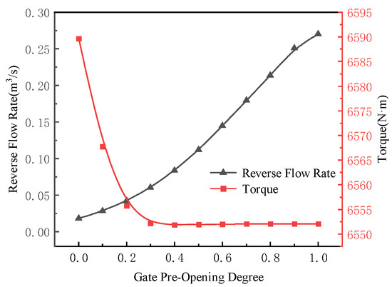 In Figure 6a, it can be seen that as the gate pre-opening angle increases, the backflow rate of the pump gradually increases. When the gate is fully open and the pump is started, the maximum backflow rate in the pump reaches a peak of 0.2701 m3/s, which is 10.98% of the design flow rate. At 20 s into the pump operation, the backflow situation disappears. However, the change in pump torque differs from the flow rate. As shown in Figure 6b, the startup torque of the pump gradually decreases with an increasing gate pre-opening angle. When the pump reaches its rated speed, the torque inside the pump reaches its maximum value. This is consistent with what is described in Reference [3], where the transient impact during pump startup reaches its peak at the rated speed. The maximum torque of the pump is observed when the gate pre-opening angle is 0, with a maximum torque of 6589.66 N·m, which is 92.41% of the calculated torque. (The torque in this calculation is derived using Equation , where P represents the motor power and n denotes the rated speed of the pump.) The curves of the maximum backflow rate and maximum torque versus the gate pre-opening angle in the experiments are shown in Figure 7.
