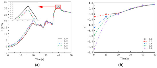 From Figure 8a, it can be observed that at 40 s, when the pump reaches its rated speed, the axial force generated by the impeller of the axial flow pump peaks. This is consistent with what is described in Reference [3], where the transient impact during the pump startup reaches its peak at the rated speed. The maximum axial force occurs when the gate opening angle is 0, with a maximum axial force of 31.67 kN, which exceeds the axial force of 18.93% after the pump reaches stable operation. Figure 8b shows that the pump efficiency is inversely proportional to the backflow rate within the pump. As the gate pre-opening angle increases, the backflow rate increases and the pump efficiency decreases. When the gate pre-opening angle is 1.0, the pump efficiency reaches its lowest point at 0.5 s after startup. At a pre-opening angle of 0, the initial efficiency of the pump during startup is 0.