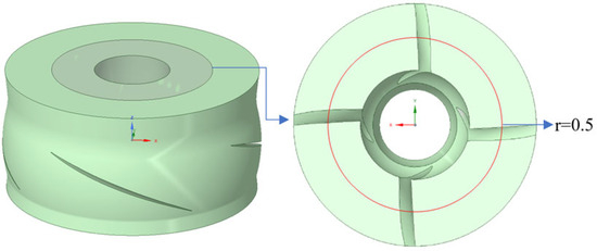 The Cero 8.0 software was used to model the three-dimensional fluid domain of the vertical axial flow pump. The model includes four parts: the intake section, impeller, guide vanes, and discharge section. The design flow rate of the pump is 2.46 m3/s, the design head is 10.2 m, and the rotational speed is 750 rpm. The main parameters are shown in Table 1, and the 3D fluid domain model and gate valve schematic are shown in Figure 1.