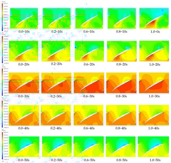 Figure 10 and Table 2 and Table 3 show the pressure contour maps of the axial flow pump impeller at a radial coefficient r = 0.5 and the corresponding maximum and minimum values of positive and negative pressure. From these figures and tables, it can be observed that the low-pressure zone is mainly concentrated at the blade tip and the inlet of the impeller. During the first 20 s of pump startup, the pressure peak is found under conditions of large gate opening (gate pre-opening angles of 0.8 and 1.0). When the pump reaches its rated speed, the maximum pressure occurs with a gate pre-opening angle of 0, with a maximum dimensionless pressure of 0.8520, followed by a pre-opening angle of 0.6, where the dimensionless pressure peak reaches 0.8378. As the pump startup reaches its rated speed, the high-pressure zone inside the impeller gradually increases. When the pump reaches its rated speed (at 40 s), the pressure distribution inside the impeller becomes uniform. When all the pump valves are fully open (At 50 s), the maximum pressure inside the pump starts to stabilize after the gate pre-opening angle reaches 0.6. At pre-opening angles of 0.8 and 1.0, the peak values of positive and negative pressures inside the pump become equal.