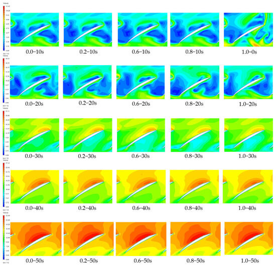 Based on this, further analysis of the internal characteristics of the impeller at a radial coefficient r = 0.5 during the startup process of the axial flow pump is conducted at 10 s, 20 s, 30 s, 40 s, and 50 s. The schematic diagram at the radial coefficient r = 0.5 is shown in Figure 9. Figure 10, Figure 11 and Figure 12 show the conditions at different times, with 0.0–10 s representing the pump running from 0 to 10 s with a gate pre-opening angle of 0.