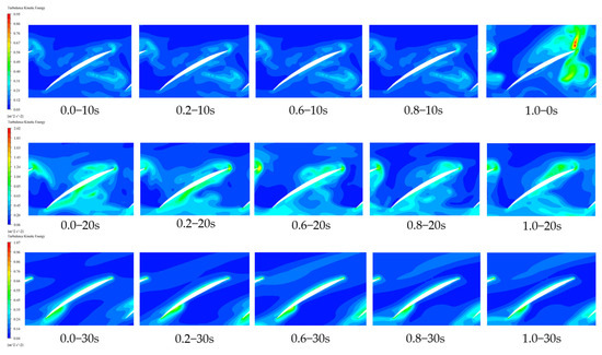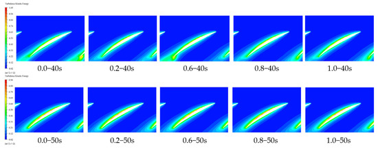 Figure 12 and Table 5 show the turbulence kinetic energy contour map and the corresponding turbulence kinetic energy extremes at the radial coefficient r = 0.5 for the axial flow pump impeller. From the figures and table, it can be observed that within the first 20 s of pump startup, the turbulence kinetic energy distribution inside the pump is uneven, with vortices forming at the blade tips. During this period, the fluid stability inside the pump is relatively poor. At 20 s into the startup, as the gate opening angle increases, the turbulence kinetic energy also increases. The maximum turbulence kinetic energy occurs with a gate pre-opening angle of 0.2, reaching 2.0214 m2/s2. At a gate pre-opening angle of 0.8, the maximum turbulence kinetic energy is 1.5897 m2/s2, which is a 27.16% decrease compared to the 0.2 opening. With a gate pre-opening angle of 1.0, the fluid stability inside the pump is relatively poor throughout the startup process, with a 6.88% increase in turbulence kinetic energy compared to the 0.8 opening. After 30 s of startup, the turbulence kinetic energy distribution inside the pump becomes more uniform, with a smooth streamline from the impeller inlet to the outlet, indicating improved fluid stability.