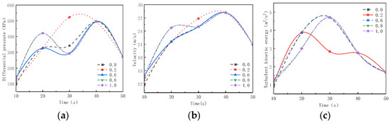 Time Variation Curves of Various Parameters at r = 0.5 of the Impeller Under Different Gate Pre-Opening Degrees. (a) Pressure Difference–Time Variation Curve; (b) Flow Velocity–Time Variation Curve; (c) Turbulent Kinetic Energy–Time Variation Curve.