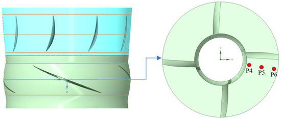 To further investigate the impact of different gate pre-lift settings on the pressure fluctuation characteristics within the axial flow pump, pressure fluctuations were measured at 10 s after pump startup under various pre-lift conditions. At this time, the pump operated at a rotational speed of 187.5 rpm. Pressure distribution was recorded every 2° during the impeller’s rotation, with a time step of 0.001778 s. The data analyzed were collected after the pump had completed four stable revolutions. To monitor the pressure fluctuations within the pump, measurement points were radially arranged at several cross-sections: the inlet of the impeller (P1–P3), the mid-section of the impeller (P4–P6), the outlet of the impeller (P5–P9), the inlet of the guide vanes (P10–P12), the mid-section of the guide vanes (P13–P15), and the outlet of the guide vanes (P16–P18). The distribution of these measurement points is illustrated in Figure 14.