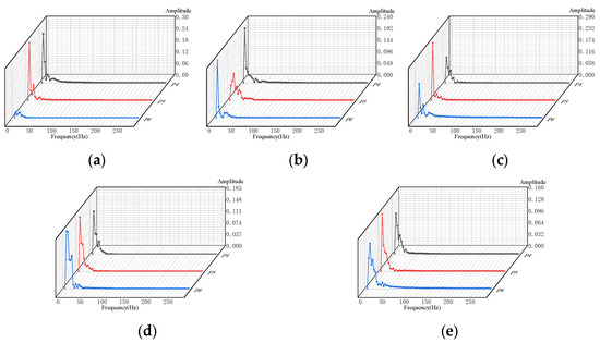 Frequency Domain Plot of Pressure Pulsations Inside the Axial Pump Impeller. (a) Pre-Opening Degree 0.0; (b) Pre-Opening Degree 0.2; (c) Pre-Opening Degree 0.6; (d) Pre-Opening Degree 0.8; (e) Pre-Opening Degree 1.0.