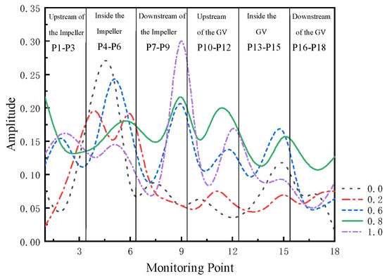 Figure 16 presents the pressure pulsation amplitude curves at various plane monitoring points for different gate opening degrees. Overall, at a gate opening of 0.2, the maximum amplitude is the smallest, measuring 0.240. This is followed by a gate opening of 0.8, where the maximum amplitude is 0.261, which is 8.70% higher than at 0.2. At a gate opening of 1.0, the maximum amplitude reaches 0.412, representing an increase of 57.96% compared to the maximum amplitude at 0.8. Combining this with the data from Figure 14, it can be concluded that when the gate opening is 0.8, the amplitude inside the pump is relatively smaller upon pump restart.