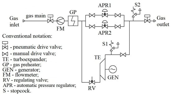 The Ukrainian gas grid is a complex system with a changing load. Its separate elements require modernization. Since resource economy is a must, the system may be complicated to secure a higher level of efficiency. One of the necessary technical decisions is differential pressure with a subsequent useful output instead of energy loss in the case of gas throttling on pressure regulators. Here, turboexpanders may recycle the gas pressure excess, while mechanical work on turbine shafts is converted into electric power [,]. This is an efficient technology to generate clean energy. In Ukraine, there are 1450 gas distribution stations (GDSs). The working pressure of gas mains is 5.5 7.4 MPa, with a possible fall to 2.5 MPa. Reduced to 0.3, 0.6, or 1.2 MPa, the station gas is gradually transferred to the distribution network, control points, and then to consumers. Simultaneously, the energy of gas pressure excess is lost.