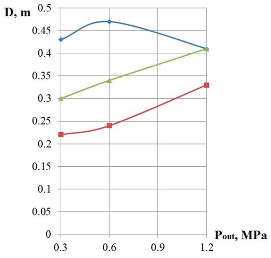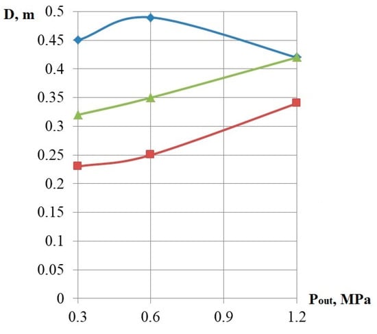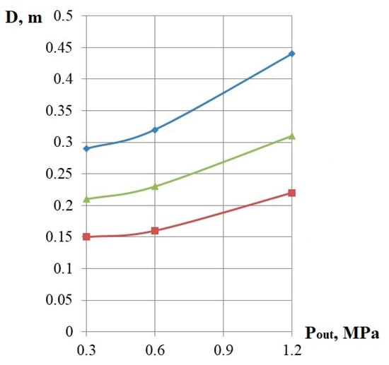 Consequently, we produce diagrams of the outer wheel diameter D (Figure 14), the turbine gas flow QT (Figure 15), and the ratio between preheated and non-preheated gas mass flow Qh/QT (Figure 16) against the outlet pressure Pout.