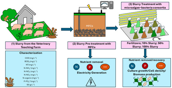 In the past century, fossil fuels have powered global economic and technological growth, but they have also caused major environmental issues like air and water pollution. Population growth and industrialization have worsened these problems, increasing wastewater production. Humanity now faces sustainability challenges, including the need for renewable energy, climate change impacts, and a lack of clean water [1,2,3]. This situation is exacerbated by the increased global demand for food, which has led to the intensification of livestock production in recent decades. Consequently, there is an increase in animal manure production, primarily slurry (liquid manure), making new strategies for manure management necessary to minimize its environmental impact and enhance its value [4]. In fact, to address these and additional problems, the United Nations proposed the 17 Sustainable Development Goals (SDGs), among which are “Affordable and Clean Energy”, “Climate Action”, and “Clean Water and Sanitation” [5]. In the European Union, and specifically in Spain, the bioeconomy emerges as an approach to promote the sustainable use of biological resources to generate economically valuable services [6]. Within this framework, the potential of micro-organisms to purify wastewater while producing bioenergy and bioproducts has been explored as a complement or alternative to regular wastewater treatment approaches that incorporate a combination of physical, chemical, and biological systems. Apart from micro-organism-based technologies, numerous methods have been demonstrated to be effective in treating pollutants from wastewater including adsorption, chemical precipitation, conventional coagulation, ion-exchange, electrolysis, and membrane technology [7].