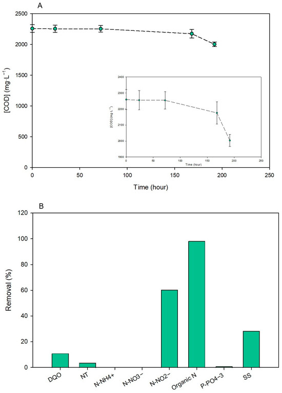 Removal of the main nutrients present in the slurry by the MFCs: (A) COD concentrations obtained after the start of the test and after 24, 72, 168, and 192 h; (B) Removal yields of COD, nitrogenous components (TN, N-NH4+, N-NO3−, N-NO2−, N-organic), P-PO43−, and suspended solids present in the slurry through the MFCs. (n = 3). Data are presented as mean values of triplicate samples ± SD.