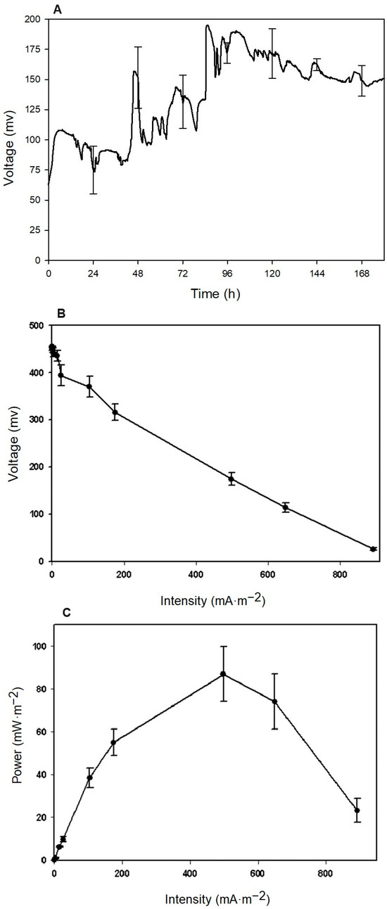 Regarding the voltage profile of the MFCs, Figure 3A shows that the voltage increased over time, reaching a maximum of 195 ± 4.2 mV at 85 h. In the polarization test, Figure 3B highlights two of the three types of losses that can be observed: activation losses, more prominent at low current densities, where a clearly defined exponential curve is observed, and ohmic losses, which are more significant at intermediate current densities and characterized by their linear behavior. Additionally, no mass transfer losses were observed, an advantage offered by single-chamber MFCs with an aerated cathode, where O2 from the surrounding air is always available. This same graph provides information about the open circuit voltage (OCV), which in this case was 455 ± 1.3 mV. Furthermore, in the polarization test, by modifying the external resistance, it was possible to determine the resistance at which the power is maximized. In this case, the power reached its maximum at an approximate resistance of 1113 Ω.