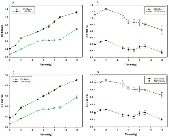 Monitoring of cell growth through optical density determined by absorbance at 680 and 750 nm: (A) growth evolution at 680 nm using fertilizer medium and 10% slurry as the culture medium; (B) growth evolution at 680 nm using 50% and 100% slurry as the culture medium; (C) growth control at 750 nm in fertilizer medium and 10% slurry; (D) evolution of optical density at 750 nm using 50% and 100% slurry as the culture medium. (n = 3). Data are presented as mean values of triplicate samples ± SD.