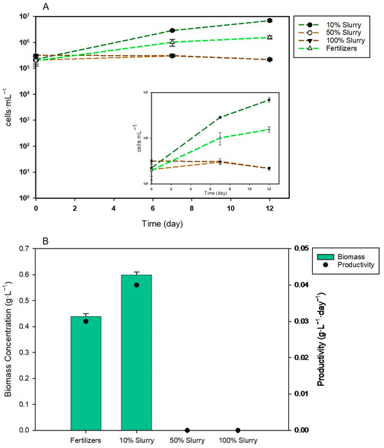 Cell density measurements and biomass productivity after the test with microalgae using fertilizers and slurry diluted to 10%, 50%, and 100% as the culture medium: (A) microalgae cell density from day 0 to the end of the test; (B) biomass and productivities obtained after the microalgae test. (n = 3). Data are presented as mean values of triplicate samples ± SD. Different letters show significant differences (p < 0.05).